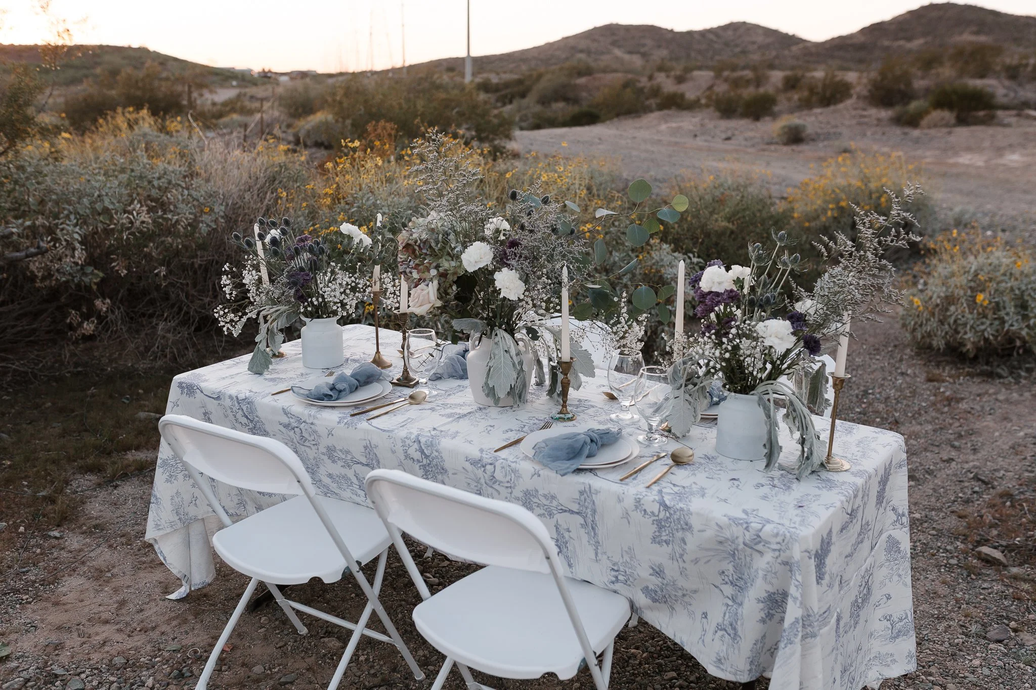 Baby Blues includes full set up, folding tables, table linens, white chairs, cloth napkins, florals, vases, candles, plates, cutlery, goblets, and pickup of our items the next day.